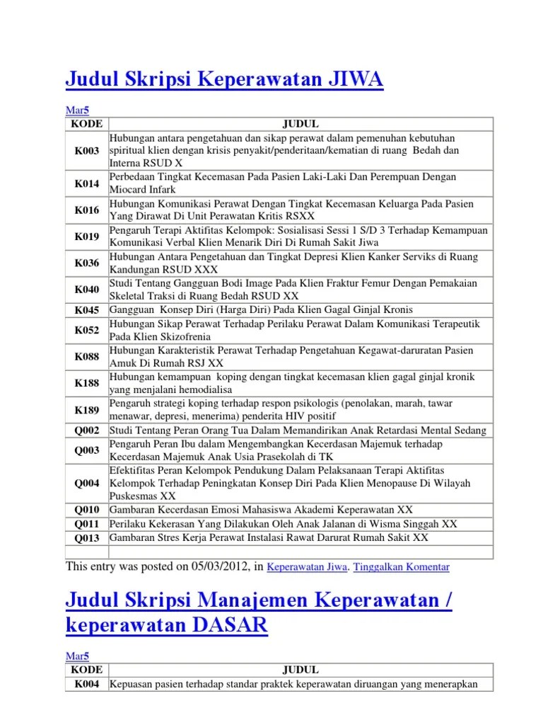 Harapan saya dengan update contoh judul skripsi keperawatan ini bisa . Dokumentasi pengkajian di ruang bogenvile rsud mgr. No judul artikel penulis download 1 strategi meningkatkan perilaku caring perawat dalam mutu pelayanan keperawatan diah fitri purwaningsih pdf 2. Contoh artikel jurnal skripsi manajemen sdm yang kami siapkan bisa menjadi bahan referensi anda dalam mengerjakan skripsi anda yang sedang . Gambaran perilaku caring perawat di ruang.